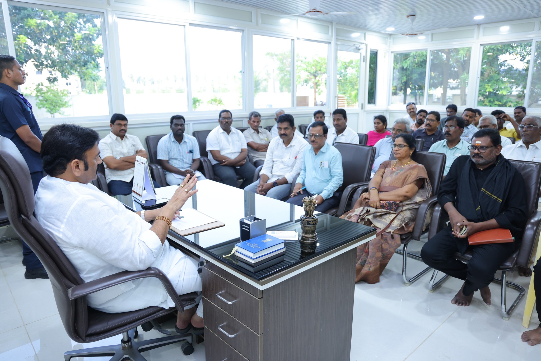 సిగ్మాతెలుగు డాట్, ఇన్ న్యూస్: ఉండి నియోజకవర్గంలోని తన కార్యాలయంలో( భీమవరం పట్టణ శివారు) నేటి సోమవారం సాయంత్రం ఆకివీడు, ఉండి మండలాలకు చెందిన అధికారులతో సమీక్షా సమావేశం నిర్వహించిన శాసనసభ డిప్యూటీ స్పీకర్ మరియు ఉండి ఎమ్మెల్యే రఘురామ కృష్ణంరాజు.. ఈ సమావేశంలో ప్లాస్టిక్ కంట్రోల్ నియంత్రణ, రోడ్లపై చెత్త వెయ్యకుండా కఠిన నిర్ణయాలు తీసుకున్నామని, నిబంధనలు పాటించని దుకాణదారులపై పెనాల్టీలు వేయాలని, అయినా తిరిగి తప్పు చేస్తే వారి దుకాణాలకు చెందిన అనుమతులను రద్దు చెయ్యాలని నిర్ణయించామని, దీనికి కాస్త కష్టమైన స్థానిక ప్రజలు, వ్యాపారస్తులు సహకరిస్తే పర్యావరణం రక్షిత, ఆరోగ్యకర ప్రాంతంగా ఉండి రాష్ట్రానికి ఆదర్శంగా మోడల్ గా నిలుస్తుందని తెలిపారు. ఇప్పటికే కాలుష్య రహిత సాగునీరు, త్రాగు నీరులో ఉండి నియోజకవర్గం మంచి ఫలితాలు సాధించిందన్నారు.
