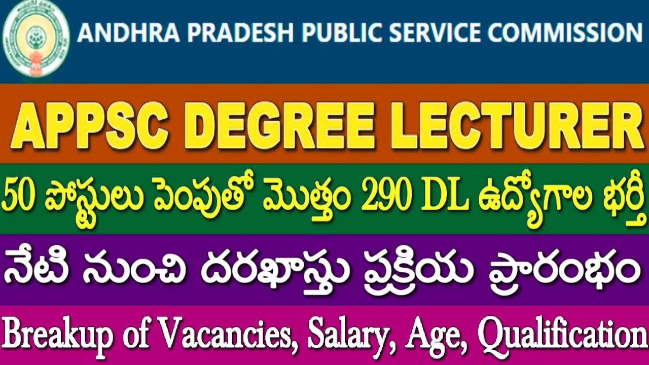 సిగ్మాతెలుగు డాట్, ఇన్ న్యూస్: ఏపీలో డిగ్రీ కళాశాలల్లో 290 లెక్చరర్ పోస్టుల భర్తీకి ఆన్ లైన్ దరఖాస్తుల ప్రక్రియ ప్రారంభమయింది. అర్హులైన అభ్యర్థులు ఏపీపీఎస్సీ వెబ్ సైట్ ద్వారా ఫిబ్రవరి 13 అర్ధరాత్రి 11.59 గంటల వరకు https://psc.ap.gov.in/ (https://portalpsc.ap.gov.in/Default.aspx) వెబ్ సైట్ దరఖాస్తు చేసుకోవాలి. గతేడాది డిసెంబర్ 30న మొత్తం 240 పోస్టుల భర్తీకి APPSC నోటిఫికేషన్ విడుదల చేయగా.. ఇప్పుడు తాజాగా మరో 50 పోస్టులను అదనంగా పెంచుతూ దరఖాస్తులను ఆన్ లైన్ లో ఆహ్వానిస్తున్నారు.