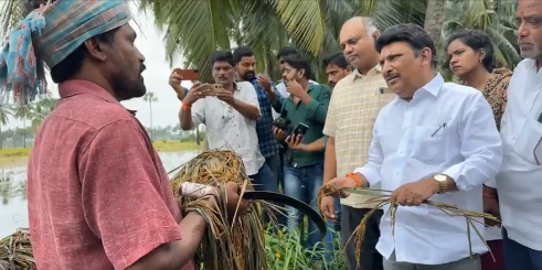 సిగ్మాతెలుగు డాట్, ఇన్ న్యూస్: పశ్చిమ గోదావరి జిల్లాలో తుఫాన్ ప్రభావంతో భీమవరం నియోజకవర్గంలోని వీరవాసరంమండలం లో తోలేరు పరిసర ప్రాంతాలలో సుడి గాలులు భయానక వాతావరణం సృష్టించడం.. పొలాలలో పంటలు చెల్లాచెదురు కాగా, చెట్లు, భారీ స్థాయిలో కరెంట్ స్తంబాలు విరిగి పడిన నేపథ్యంలో స్థానిక ఎమ్మెల్యే గ్రంధి శ్రీనివాస్ రాత్రి వర్షంలో వెళ్లి వీరవాసరం నష్టపోయిన బాధితులను పరామర్శించి ప్రభుత్వం అండగా ఉంటుందని హామీ ఇచ్చారు. అయితే వీరవాసరం లో పూర్తీ నష్టాన్ని అంచనా వెయ్యడానికి నేటి బుధవారం ఉదయం ఎమ్మెల్యే గ్రంధి శ్రీనివాస్ మరో మరు వీరవాసరం మండలంలో పలు గ్రామాలలో దారుణంగా దెబ్బ తిన్న వరి చేలను పరిశీలించి, రైతులతో మీడియా తో మాట్లాడుతూ.. ఇక్కడ 6 రకాల ధాన్యపు పంటలు పండిస్తున్నారని, 160 రోజులలో పంట చేతికొస్తుందని ఇప్పటికి 90 శాతం పండేసిందని ఇంకో 10 లేక 15 రోజులలో పంట చేతికొస్తుందనగా ఇలా తుపాను కబళించడం రైతులకు తీవ్ర నిరాశ కలిగిస్తుందని.. అయితే దాదాపు అందరికి పంట ఇన్సూరెన్స్ వస్తుందని బయపడవల్సిన అవసరం లేదని .. అయినప్పటికీ ఈ సార్వా పంట ను వ్యవసాయ అధికారుల సూచనలు పాటిస్తూ విత్తనాలు చెల్లించినవారు ఇప్పటికే పంట కోసేశారని .. ఇక ముందు అందరు అధికారుల సూచనలు పాటించాలని సూచించారు. జగన్ సర్కార్ హయం లో వ్యవసాయం పండుగ అని, పడిపోయిన చెట్లను తొలగిస్తున్నామని, భారీగా కూలిన కరెంట్ స్తంబాలు నిలబెట్టి త్వరితంగా విద్యుత్ ను పునరుద్ధరిస్తామన్నారు.