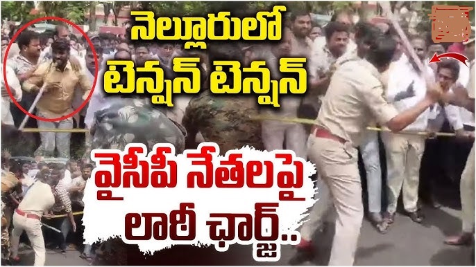 సిగ్మాతెలుగు డాట్, ఇన్ న్యూస్: నెల్లూరు లో నేడు, మాజీ సీఎం జగన్ పర్యటిస్తున్న వేళా ఆయనతో పాటు కొద్దీ మంది మాత్రమే ఉండాలని పోలీస్ ఆంక్షలు నేపథ్యంలో ఎప్పటి లానే జగన్ తో వేలాది మంది వైసీపీ అభిమానులు తరలి రావడంతో రోడ్లు కిక్కిరిసి పోవడంతో పోలీసులు ట్రాఫిక్ నియంత్రించడానికి వారిపై లాఠీ ఛార్జ్ చెయ్యడం తాడు ప్రక్కన నిలబడిన వారి కాళ్ళపై లాఠీ లతో కొట్టుకొంటూ వెళ్లడం వైసీపీ నేతల ఆందోళన లతో .. తన చేతిపై పోలీసులు కొట్టారని వేలు పనిచెయ్యడం లేదని, మాజీ వైసీపీ ఎమ్మెల్యే ప్రసన్న రెడ్డి రోడ్డుపై బెటాయించడం తో హైటెన్షన్ వాతవరణం నెలకొంది. జగన్ కార్యక్రమంలో పాల్గొనడానికి శాంతిభద్రతల దృష్ట్యా అనుమతి లేదని, ధిక్కరిస్తే తీవ్ర చర్యలు ఉంటాయని వైసీపీ ముఖ్యనేతలతో పాటు కొందరు నేతలకు పోలీసులు నోటీసులు జారీ చేశారు.చాల మందిని ముందే అదుపులోకి తీసుకొన్నారు. అయినప్పటికీ రోడ్లపై కార్యకర్తలు పెద్ద ఎత్తున వేలాదిగా తరలి రావడం విశేషం. ఇదిలా ఉండగా నెల్లూరు జైలులో పలు కేసుల్లో రిమాండ్‌లో ఉన్న మాజీ మంత్రి కాకాణితో జగన్ ములాకత్ అయ్యారు. . అనంతరం జైలు నుంచి మాజీ ఎమ్మెల్యే ప్రసన్న(Ex MLA Prasanna) నివాసానికి చేరుకొని ఆయన తల్లిని ఇతర కుటుంబ సభ్యులను పరామర్శించారు.