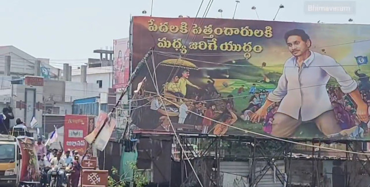 సిగ్మాతెలుగు డాట్ ఇన్ న్యూస్: ఇటీవల రాష్ట్ర వ్యాప్తంగా వైసిపి అభిమానులు కడుతున్న ఒక కార్టూన్ ప్లెక్సీ పెను సంచలనం సృష్టిస్తుంది. ఆ ప్లెక్సీలను పలు ప్రాంతాలలో టీడీపీ జనసేన పార్టీలు తొలగించేదానికి చేసే ప్రయత్నాలు కూడా అధికార వైసీపీ నేతలతో ఘర్షణ వైఖరికి కారణం అవుతున్నాయి. దీనిపై టీడీపీ, జనసేన పార్టీలు తీవ్ర అభ్యంతరం వ్యక్తం చేస్తున్నారు. ఈ నేపథ్యంలో పశ్చిమగోదావరి జిల్లా భీమవరం లో ప్రకాశం చౌక్ సెంటర్ లోను, ఆదివారం బజారుసెంటర్ తో పాటు.. నియోజకవర్గం లోని పలు కూడళ్లలోపాటు .. తణుకు పట్టణం లోని ప్రధాన కూడళ్లలో …పేదలకు, పెత్తం దార్లకు మధ్య జరిగే యుద్ధం .. అంటూ ఈ ఫ్లెక్సీ లను ఏర్పా టు చేసిన ఫ్లెక్సీలు ను వాహనదారులు స్థానిక ప్రజలు ఆసక్తిగా తిలకిస్తున్నారు. ఇంతకీ ఆ ఫ్లెక్సీ లలో ఏముందంటే..చంద్రబాబు, నారా లోకేశ్ రధం లాంటి పల్లకీలో కూర్చుని ఉంటే.. కొన్ని మీడియా యాజమాన్యాలు, జనసేన అధినేత పవన్ కళ్యాణ్ తదితరులు దానిని మోస్తున్నట్టు ఉంది. వారి పక్కనే నిలబడి ఉన్న పెత్తందారులు మరోవైపు ఉన్న పేదల పైకి రాళ్లు విసురుతున్నట్టుగా ఉంది.. అయితే పేదలకు అండగా భారీ ఆకారం లో హీరో మహేష్ బాబు తరహాలో సీఎం జగన్ పేదలకు అండగా నిలబడి పెత్తం దార్లు విసురుతున్న రాళ్లు పేదలకు తగలకుండా నిలబడి ఉన్నారు. ఈ యుద్ధం లో పేదవారికిఅండగా జగనన్న ప్రభుత్వం ఉంది. అందరూ ఒక్కసారి ఆలోచన చేయండి, ఈ యుద్ధం లో మీ మద్దతు ఎవరివైపు..? అంటూ క్యాప్షన్ ఉంది. ఏమిటి ఈ ఫ్లెక్సీ విచిత్రంగా ఉంది అని బస్సులలో వెళ్లేవారు కూడా ఆసక్తిగా చూస్తున్నారు.