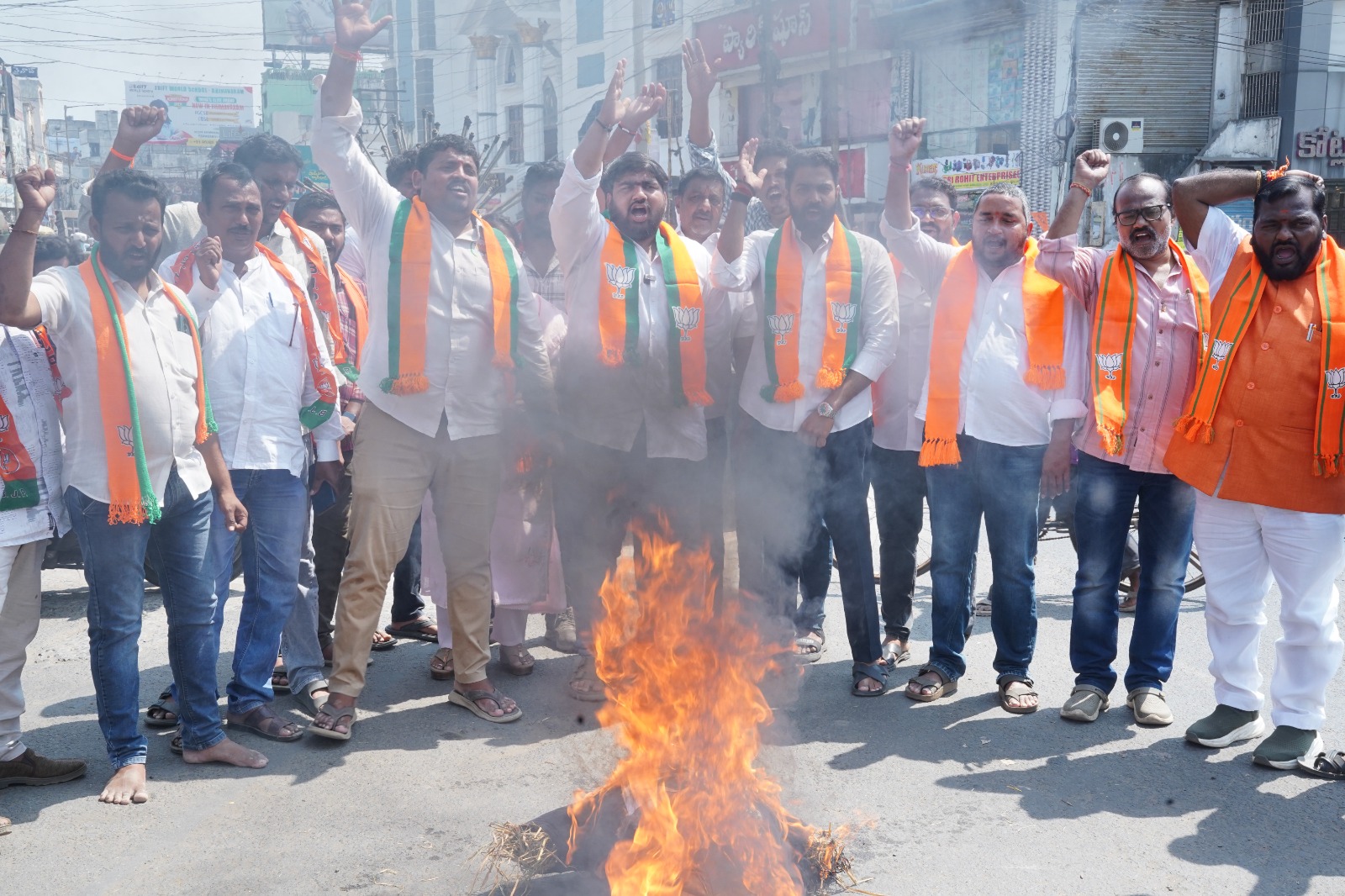 సిగ్మా తెలుగు డాట్, ఇన్ న్యూస్: న్యూఢిల్లీలో ప్రతిష్టాత్మకంగా జరుగుతున్న ‘గ్లోబల్ ఏఐ సమ్మిట్‘లో అక్రమంగా చొరబడి విదేశీ ప్రముఖుల ముందు దేశ ప్రతిష్టను మసకబార్చేలా ప్రవర్తించిన అసభ్యంగా ప్రవర్తించిన యూత్ కాంగ్రెస్ నాయకులను తక్షణమే అరెస్ట్ చేయాలని డిమాండ్ చేస్తూ భారతీయ జనతా యువమోర్చా (BJYM) ఆధ్వర్యంలో నేడు, సంవిదిరం భీమవరం ప్రకాశం చౌక్ వద్ద దిష్టిబొమ్మ దగ్ధం చేసి నిరసన చేపట్టారు. మొదట స్థానిక కాంగ్రెస్ పార్టీ కార్యాలయాన్ని ముట్టడించేందుకు బీజేవైఎం నాయకులు, కార్యకర్తలు యత్నించారు. ఈ క్రమంలో పోలీసులు బారికేడ్లు పెట్టి అడ్డుకోవడంతో కొద్దిసేపు పోలీసులకు, బీజేవైఎం శ్రేణులకు మధ్య వాగ్వాదం చోటుచేసుకుంది. అనంతరం ప్రకాశం చౌక్ వద్దకు చేరుకున్న కార్యకర్తలు, కాంగ్రెస్ పార్టీ దిష్టిబొమ్మకు పెట్రోల్ పోసి దహనం చేసి తమ ఆగ్రహాన్ని వ్యక్తం చేశారు. ఈ నిరసన కార్యక్రమంలో జిల్లా ప్రధాన కార్యదర్శి కలిదిండి వినోద్ వర్మ,బీజేవైఎం రాష్ట్ర ఉపాధ్యక్షురాలు పైడికొండల సింధు, బీజేవైఎం రాష్ట్ర కార్యదర్శి వినయ్, తదితరులు కార్యకర్తలు పెద్ద సంఖ్యలో పాల్గొన్నారు.