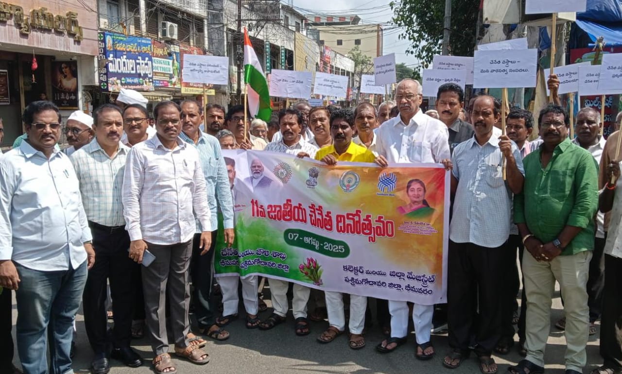 సిగ్మాతెలుగు డాట్, ఇన్ న్యూస్: పశ్చిమ గోదావరి జిల్లా చేనేత శాఖ ఆధ్వర్యంలో ఏర్పాటు చేసిన 11వ జాతీయ చేనేత దినోత్సవ ర్యాలీని నేడు, గురువారం భీమవరం ప్రకాశం చౌక్ లో ఎమ్మెల్యే అంజిబాబు ప్రారంభించి మాట్లాడారు. చేనేత అభివృద్ధికి ప్రతి ఒక్కరూ తమ వంతు సహకారం అందించాలని, ప్రజలు చేనేత వస్త్రాలు కొనుగోలు ద్వారా చేనేత కార్మికులను ప్రోత్సాహం లభిస్తుందన్నారు. అన్ని కాలాలకు తగినట్లు చేనేత వస్త్రాలు ధరించడంలో సౌలభ్యంతోపాటు, ఆరోగ్యపరంగా కూడా మంచి చేకూరుతుందన్నారు. ప్రపంచ వ్యాప్తంగా 95 శాతం చేనేత ఉత్పత్తులు మన దేశం నుండే ఉన్నాయని, నేటి యువతకు చేనేత వస్త్రాల గురించి పెద్దలు చెప్తే గానీ తెలియని విషయంగా మారిందన్నారు. అనంతరం ప్రకాశం చౌక్ సెంటర్ నుంచి మున్సిపల్ కార్యాలయం వరకు ర్యాలీ నిర్వహించారు. తహసీల్దార్ రావి రాంబాబు కూటమి నాయకులు కార్యకర్తలు, ప్రభుత్వ అధికారులు పాల్గొన్నారు.