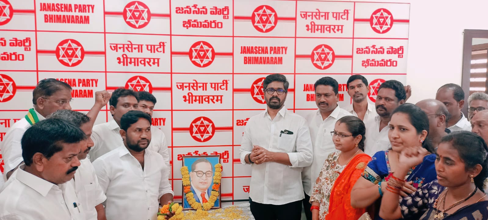 సిగ్మాతెలుగు డాట్, ఇన్ న్యూస్: భారత రాజ్యాంగ నిర్మాత, ప్రపంచ మేధావి డాక్టర్ బి.ఆర్ అంబేద్కర్ గారి 132 వ జయంతి సందర్భంగా భీమవరం జనసేన పార్టీ ఆఫీస్ నందు అంబేద్కర్ గారి చిత్రపటానికి పూలమాలలు వేసి నివాళులు అర్పించిన జనసేన పార్టీ ఉమ్మడి పశ్చిమగోదావరి జిల్లా అధ్యక్షులు, భీమవరం నియోజకవర్గ ఇంఛార్జి గోవిందరావు మాట్లాడుతూ.. భారత రాజ్యాంగ నిర్మాతగా, బడుగు, బలహీనవర్గాల వారికి భారత సమాజంలో సముచిత స్థానం కోసం అంబేద్కర్ చేసిన కృషి ని, పోరాటాన్ని మన జనసేన ఆదర్శంగా తీసుకోని,పవన్ కళ్యాణ్ నాయకత్వంలో రాష్ట్రంలో ప్రజల హక్కులు, ప్రజాస్వామ్య పరిరక్షణ కు కృషి చెయ్యాలని పిలుపు నిచ్చారు. ఈ కార్యక్రమంలో పాల్గొన్న భీమవరం పట్టణ,భీమవరం మండలం ,వీరవాసరం మండలం నాయకులు,MPTC లు, జనసైనికులు, వీర మహిళలు.మరియు రాష్ట్ర నాయకులు మల్లినిడి తిరుమల రావు, బండి రమేష్ కుమార్,భీమవరం పట్టణ అధ్యక్షుడు చెనమల్ల చంద్ర శేఖర్, ,భీమవరం మండల అధ్యక్షులు మోకా శ్రీనివాస్, పట్టణ సెక్రటరీ సుంకర రవి, మండల సెక్రటరీ కత్తుల నీలేంద్ర,భీమవరం మండల Mptc లు గుల్లిపల్లి విజయలక్ష్మీ , తాతపూడి రాంబాబు, అరేటి వాసు, మాజీ కౌన్సిలర్ మాగపూ ప్రసాద్ , లక్కోజు నాని ,RSR,హరి వర్థన్, కట్రెడ్డి రాము,అప్పారావు, పద్మారావు, గుండా బాబు, మోపిదేవి జగన్, రామ్ ప్రసాద్, గాస్ శ్రీను, వీర మహిళలు తదితరులు పాల్గొన్నారు.