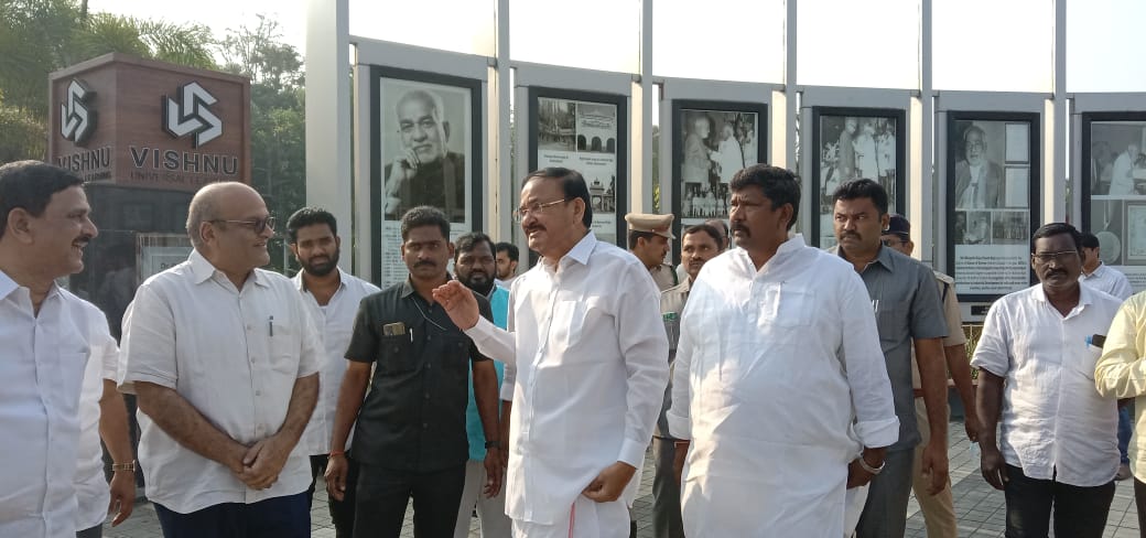 సిగ్మాతెలుగు డాట్, ఇన్ న్యూస్: మాజీ భారత ఉపరాష్ట్రపతి వెంకయ్య నాయుడు శనివారం పశ్చిమగోదావరి జిల్లా కేంద్రం , భీమవరం లో తన పర్యటన కొనసాగిస్తున్నారు. ఈ సందర్బంగా భారత దేశ మాజీ ఉప రాష్ట్రపతి, వెంకయ్య నాయుడు ముందుగా ఉదయం 8 గంటలకు విష్ణు పూర్ లోని విష్ణు ఇంజనీరింగ్ కాలేజీ గెస్టు హౌస్ కు చేరుకొని కొద్దీ విరామం తరువాత బివి రాజు విద్యాసంస్థల అధినేత పద్మ విభూషణ్ డాక్టర్ బీవీ రాజు దంపతుల స్మారక మందిరం వద్ద ఘన నివాళ్లు అర్పించడం జరిగింది. ఈ కార్యక్రమం లో , బివి రాజు విష్ణు సంస్థల చైర్మెన్ విష్ణు రాజు మరియు మాజీ ఉపరాష్ట్రపతిని మర్యాద పూర్వకంగా కలసిన రాష్ట్ర శాసనమండలి ఛైర్మెన్ కొయ్యే మోషేను రాజు, బీజేపీ పార్టీ రాష్ట్ర కార్యదర్శి భూపతి రాజు శ్రీనివాస వర్మ కూడా పాల్గొన్నారు. తదుపరి కాలేజీ ఆవరణలో ఉన్న దేవాలయం లో దైవ దర్శనం చేసుకొని పూజలు నిర్వహించారు. నేటి మధ్యాహ్నం విష్ణు ఇంజనీరింగ్ విద్యార్థులనుద్దేశించి ముప్పవరపు వెంకయ్య నాయుడు ప్రసంగించనున్నారు.