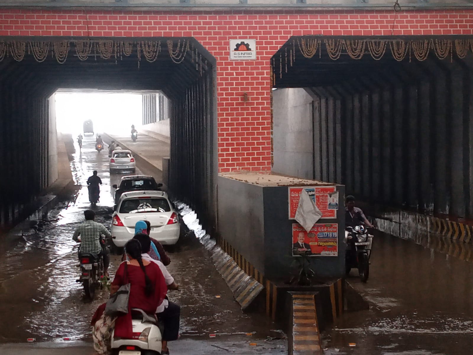 సిగ్మాతెలుగు డాట్ ఇన్, న్యూస్: భీమవరం పట్టణంలో అంబేద్కర్ సెంటర్ నుండి టీపీ గూడెం వైపు వెళ్లే ప్రధాన రహదారిలో నిర్మించిన భారీ రైల్వే టర్నల్ బ్రీజ్ కొద్దీ కాలం క్రితం ప్రారంభము అయ్యి ట్రాఫిక్ రద్దీని బాగా తగ్గించిన మాట వాస్తవం.. ప్రతి రోజు వేలాది వాహనాలు , విద్యార్థులు ఈ టర్నల్ క్రింద నుండి రోజు ప్రయాణిస్తున్నారు. అయితే బ్రీజ్ మధ్యలో ప్రధాన రైల్వే ట్రాక్ క్రింద నిర్మించిన అండర్ టర్నల్ వద్ద గత నెల రోజులుగా క్రింద నుండి నీరు ఊరటం లేదా డ్రైనేజ్ లీక్ అవ్వడంతో అక్కడ ఒక అడుగు మేర మురుగునీరు నిలిచిపోయి వాహనదారులకు చాల ఇబ్బందిగా ఉంటుంది. వేగంగా వచ్చే వాహనాలు అకస్మాత్తుగా లోతులో అక్కడ నీరు ఉండటం చూసి వేగం అదుపు చేయలేకపోతున్నారు. దీనితో ప్రక్కన వెళ్లే ద్విచక్ర వాహనదారులపై ఆ నీరు చిమ్ముతుంది. అలాగే బైకు లు స్క్రిడ్ అయ్యి జారిపోయే ప్రమాదం పొంచి ఉంది.. ఈ మురుగునీటి సమస్య ఎక్కడ ఉంది ? అన్నది రైల్వే ఇంజనీర్లు , స్థానిక మునిసిపల్ అధికారులు సమన్వయంతో పనిచేసి త్వరితంగా సరిచేస్తే ద్విచక్ర వాహనదారులకు ఇబ్బందులు తగ్గుతాయి. నిజానికి అండర్ టర్నల్ నిర్మాణంలో ఎపుడయిన వర్షపు నీరు చేరితే మోటరుతో తోడెయ్యడానికి ఆధునిక ఆటోమేటిక్ సెన్సార్ ఏర్పాటు చేస్తామన్నారు కానీ ప్రస్తుత ఈ సమస్యకు కారణం తెలియవలసి ఉంది. ( up update photo)