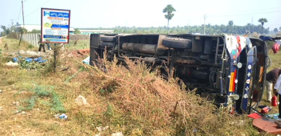 సిగ్మా తెలుగు డాట్, ఇన్ న్యూస్: కాకినాడ జిల్లా గొల్లప్రోలు మండలం చేబ్రోలు శివారులో జాతీయరహదారిపై 24 మంది ప్రయాణికులతో వెళుతున్న ప్రవేటు ట్రావెల్స్బస్సు నేడు, సోమవారం తెల్లవారు జామున బోల్తా పడిం ది. ఈ ప్రమాదంలో 10 మందికి గాయాలయ్యాయి. ఈ ప్రెవేటు ట్రావెల్స్ బస్సు శ్రీకాకుళం నుంచి భీమవరం కు వెళ్తోంది. మార్గం మధ్య లో చేబ్రోలు శివారుకి రాగానే.. బస్సు రహదారి పక్క నే ఉన్న కటౌట్ను ఢీ కొట్టడంతో ఆందోళనతో డ్రైవర్ బ్రేక్ వేయడం తో బస్సు రహదారి పక్క నే ఉన్న పొలం లోకి వెళ్లి బోల్తా పడిందని పోలీసులు తెలిపారు. ఈనేపథ్యంలో స్థానిక పోలీసులు సీఐ శ్రీనివాస్, ఘటనాస్థలికి చేరుకుని గాయపడిన వారిని పిఠాపురం ప్రభుత్వా సుపత్రికి తరలిం చారు.