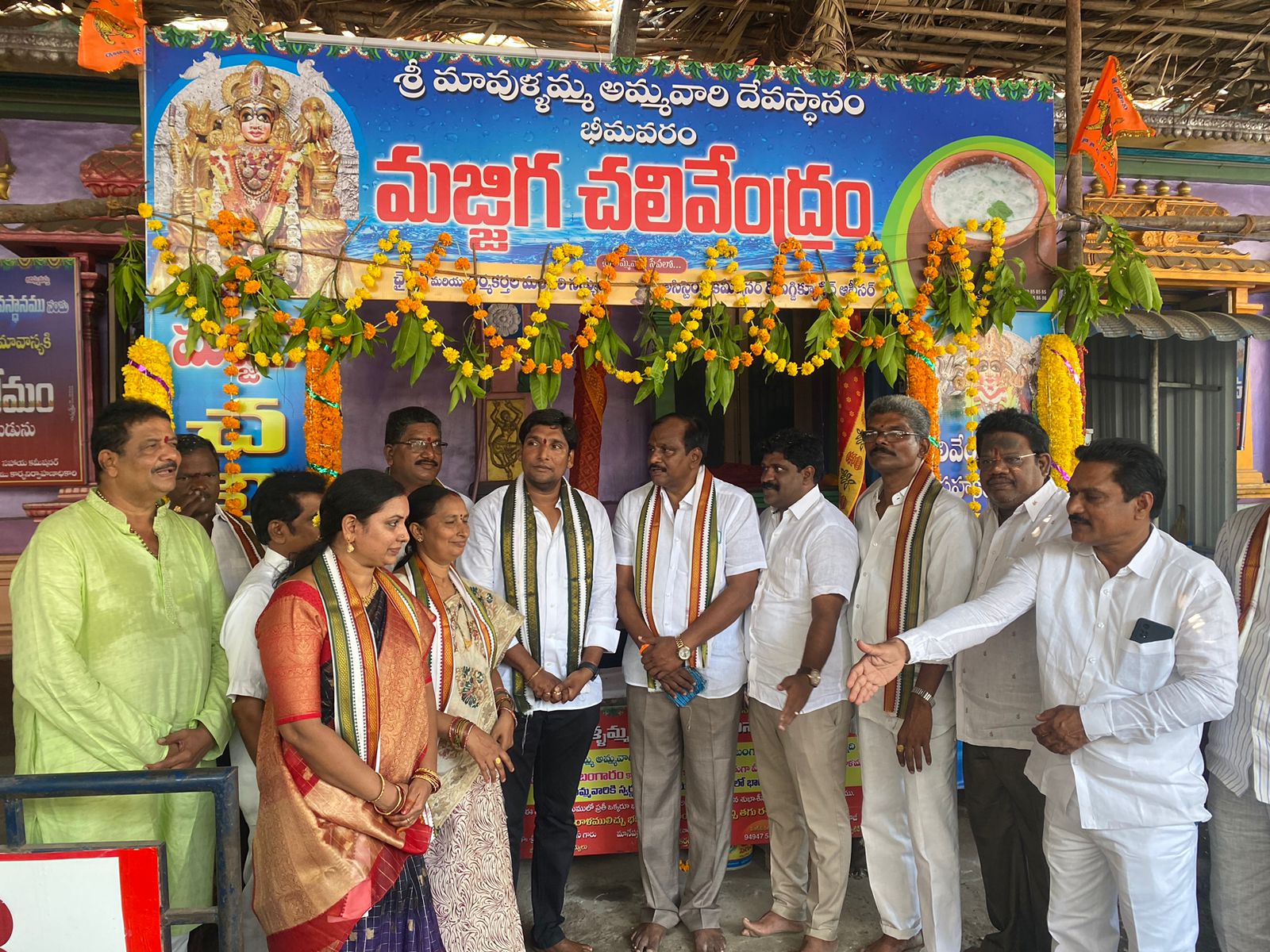 సిగ్మాతెలుగు డాట్ ఇన్, న్యూస్: భీమవరం పురాధీశ్వరి శ్రీశ్రీ శ్రీ మావుళ్ళమ్మ అమ్మవారి దేవస్థానము నందు మజ్జిగ చలివేంద్రమును నేడు, ఆదివారం ఉదయం స్థానిక ఎమ్మెల్యే గ్రంధి శ్రీనివాస్ కుమారుడు, గ్రంధి రవితేజ్ చేతులు మీదుగా ప్రారంభించడమైనది. ఆలయ ప్రధాన అర్చకులు శ్రీమద్దిరాల మల్లిఖార్జున శర్మ పూజాధికార్యక్రమములు నిర్వహించారు. ఈ మజ్జిగ చలివేంద్రంకు దాతగా రావాడ రామోహ్మనరావు వరలక్ష్మీ దంపతులు, విజయకిరణ్ బయోటెక్ భీమవరం వారి సహాకారంతో దేవస్థానము వారు నిర్వహిస్తున్నారు. మండు వేసవిలో శ్రీ అమ్మవారి కరుణతో దేవాలయ ఆవరణ వైపు వెళ్లే వారి దాహార్తిని ఉచితంగా చల్లటి మజ్జిగ తో తీర్చే సంప్రదాయం ఈ ఏడాది కూడా దాతల సహకారంతో నిర్వహిస్తున్నారు. ఈ కార్యాక్రమములో ఆలయ సహాయ కమీషనరు మరియు కార్యనిర్వహణాధికారి యర్రంశెట్టి భద్రాజీ, ఆలయ ఛైర్మన్ మానేపల్లి నాగేశ్వరరావు, ధర్మకర్తల మండలి సభ్యులు రామాయణం సత్యనారాయణ, ముత్యాల వెంకట రామారావు, మావూరి సుందరరావు, బాగ్యలక్ష్మి కె. వెంకటలక్ష్మి జి. విజయలక్ష్మి, మరియు భక్తులు పాల్గొన్నారు. .