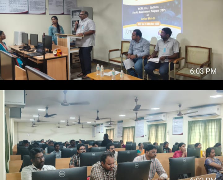 సిగ్మా తెలుగు డాట్, ఇన్ న్యూస్: భీమవరంలోని శ్రీ విష్ణు ఇంజనీరింగ్ కాలేజ్ ఫర్ ఉమెన్ (అటానమస్) కళాశాలలోని ఆర్టిఫిషియల్ ఇంటెలిజెన్స్ విభాగం నేడు సోమవారం జునిపర్ నెట్‌వర్క్స్ సెంటర్ ఆఫ్ ఎక్సలెన్స్ ను ప్రారంభించింది, ఆ తర్వాత ‘మిస్ట్ ఎ.ఐ.’ పై ఆరు రోజుల ఫ్యాకల్టీ డెవలప్‌మెంట్ ప్రోగ్రామ్ ప్రారంభమైంది. ఈ శిక్షణ తరగతులను ఈ నవంబర్ 24నుండి 29 నవంబర్ 2025 వరకు జునిపర్ నెట్‌వర్క్స్ మద్దతుతో ఎడ్యుస్కిల్స్ ఫౌండేషన్‌ నిర్వహిస్తుంది. ఎ.ఐ. ఆధారిత నెట్‌వర్కింగ్, నెట్‌వర్క్ ఆటోమేషన్, మిస్ట్ ఎ.ఐ. క్లౌడ్ ఆర్కిటెక్చర్, జూనోస్ ఆపరేటింగ్ సిస్టం, మార్విస్ ఎ.ఐ., జీరో ట్రస్ట్ నెట్‌వర్క్‌లు మరియు తదుపరి ‘క్యాంపస్ నెట్‌వర్క్ ఆటోమేషన్‌లో అధునాతన నైపుణ్యాలతో అధ్యాపకులను నిపుణులుగా తీర్చిదిద్దే లక్ష్యంతో’ ఈ కార్యక్రమాన్ని నిర్వహించడం జరుగుతుంది. ఎడ్యుస్కిల్స్ ఫౌండేషన్ టాలెంట్ డెవలప్‌మెంట్ మేనేజర్, మితు స్వైన్ గారి సమక్షంలో ‘సెంటర్ అఫ్ ఎక్స్లెన్స్’ మరియు ‘ఫాకల్టీ డెవలప్మెంట్ ప్రోగ్రాం’ లు ప్రారంభించబడ్డాయి. ఆయన మాట్లాడుతూ ఎ.ఐ. ఆధారిత నెట్‌వర్క్ నిర్వహణ కోసం వేగంగా పెరుగుతున్న ప్రపంచ డిమాండ్‌ను ఆయన నొక్కిచెప్పారు, ఈ కార్యక్రమానికి కళాశాల వైస్ ప్రిన్సిపాల్ ప్రొఫెసర్ పి. వెంకట రామరాజు ,ఆర్టిఫిషియల్ ఇంటెలిజెన్స్ విభాగాధిపతి డాక్టర్ ఎ. శ్రీ కృష్ణ , అధ్యాపకులు, విద్యార్థులు పాల్గొని, జయప్రదం చేయడం జరిగింది.
