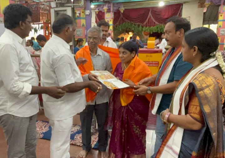 సిగ్మా తెలుగు డాట్, ఇన్ న్యూస్: భీమవరం పురాధీశ్వరి శ్రీశ్రీ శ్రీ మావుళ్ళమ్మ అమ్మవారికి నిలువెత్తు మూలవిరాట్, సంపూర్ణ స్వర్ణమయం స్వర్ణ నిధికి హైదరాబాద్ కి చెందిన భక్తుడు, దొంతికుర్తి రామమూర్తి ఝాన్సీ లక్ష్మి దంపతులు శ్రీ అమ్మవారిని నేడు, శుక్రవారం దర్శించుకొని ఒక లక్ష ఏబది వేలు రూపాయలు విలువ కల పది గ్రాముల బంగారం సమర్పించారు, దీనితో పాటుగా అన్న ప్రసాద వితరణ కు 5,116/- రూపాయలు..కానుకగా సమర్పించారు…వీరికి ఆలయ అర్చకులు పూజలు ఆశీర్వచనాలు నిర్వహించారు.ఆలయ ధర్మకర్తలు అతికెల ఆంజనేయ ప్రసాద్, మల్లువలస లక్ష్మి నిర్మల ప్రసాదం ఫోటో అందచేసారు.