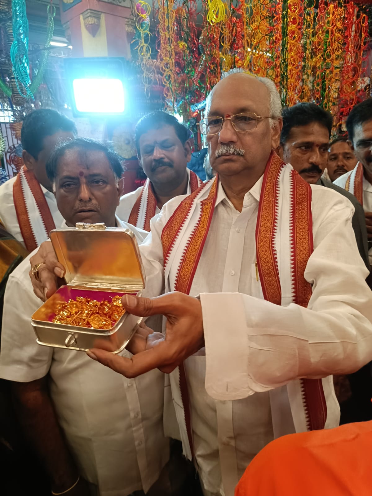 సిగ్మాతెలుగు డాట్, ఇన్ న్యూస్: త్వరలోనే భీమవరం శ్రీమావుళ్ళమ్మ అమ్మవారి స్వర్ణ వస్త్రాన్ని పూర్తి చేస్తామని రాష్ట్ర పబ్లిక్ అకౌంట్స్ కమిటీ చైర్మన్ ఎమ్మెల్యే పులపర్తి రామాంజనేయులు అన్నారు. నేడు, శ్రావణ శుక్రవారం భీమవరం పురాధీశ్వరి శ్రీశ్రీశ్రీ మావుళ్ళమ్మ అమ్మవారి ని సుమారు 9 లక్షల గాజులతో అలంకరణ చేశారు. వేలాదిగా భక్తులు శ్రీ అమ్మవారిని దర్శించుకొంటున్నారు. 3 రోజుల పాటు ఈ అలంకరణ ఉంటుంది. గాజుల అలంకరణలో దర్శనమిస్తున్న అమ్మవారిని ఎమ్మెల్యే అంజిబాబు దర్శించుకున్నారు. ఆయన శ్రీ అమ్మవారికి భక్తులు కానుకగా సమర్పించిన సుమారు 11 లక్షల రూపాయలు ఖర్చుతో తయారు చేయించిన 108 గ్రాముల బంగారు పుష్పాలను ఎమ్మెల్యే అంజిబాబు చేతుల మీదుగా ఆలయ ఈవో బుద్ధ మహాలక్ష్మి నగేష్ కు అందించారు. ఎమ్మెల్యే అంజిబాబు మాట్లాడుతూ .. అమ్మవారి స్వర్ణ వస్త్రానికి దాతలు ముందుకు వస్తున్నారని, ఇంకా సుమారు మరో 25 కేజీల బంగారం కావాల్సి ఉందని, రాష్ట్రంలోనే పేరుగాంచిన మావుళ్ళమ్మ అమ్మవారికి స్వర్ణ వస్త్రాన్ని తయారు చేస్తామని అన్నారు. అనంతరం ఆలయ ప్రధానార్చకులు మద్దిరాల మల్లిఖార్జున శర్మ ప్రత్యేక పూజలను నిర్వహించి దాతలకు ఆశీర్వచనాలు అందించి సత్కరించారు.