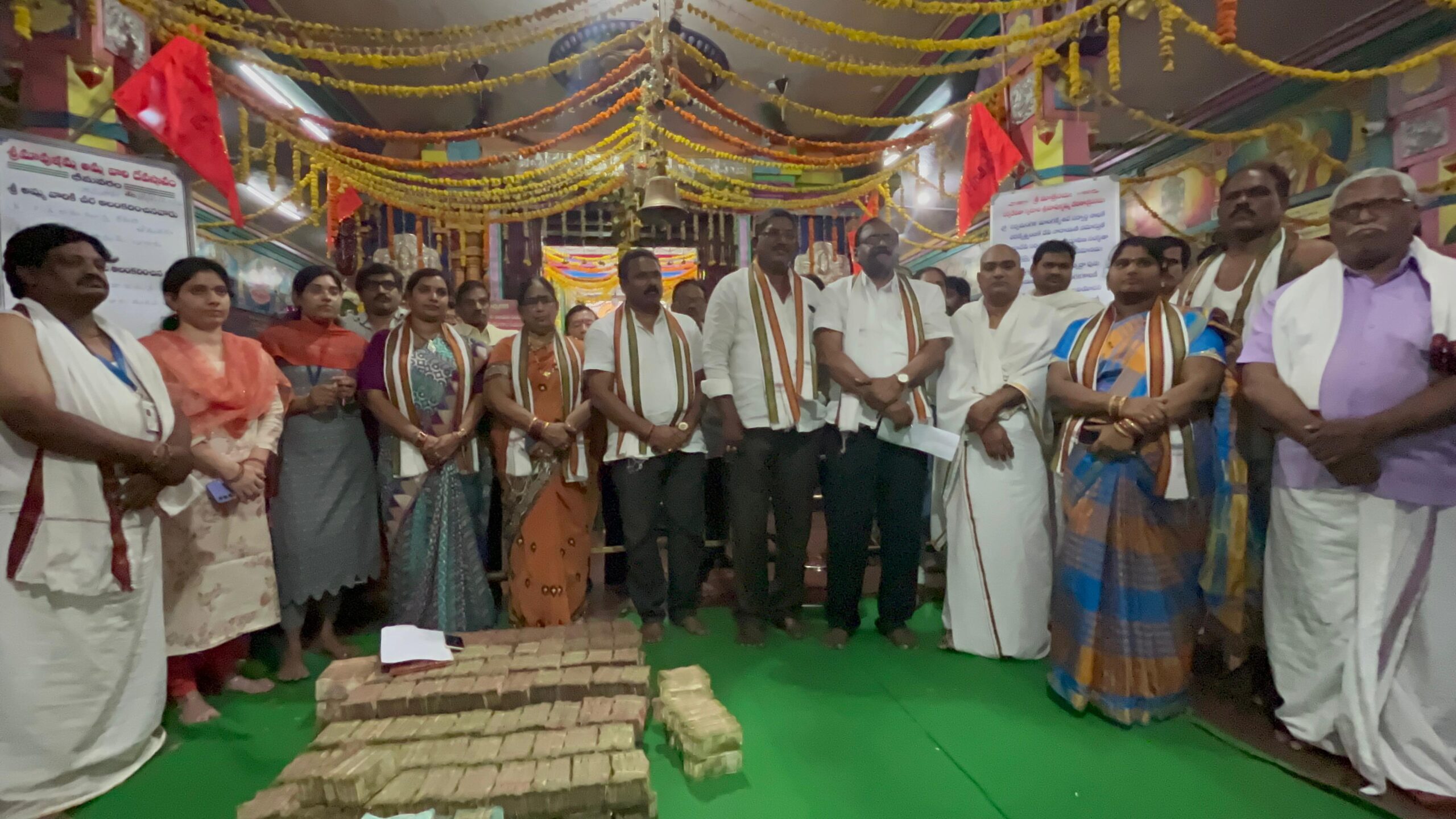 సిగ్మాతెలుగు డాట్, ఇన్ న్యూస్: భీమవరం పురాధీశ్వరి శ్రీశ్రీ శ్రీ మావుళ్ళమ్మ అమ్మవారికి శ్రీ మావుళ్ళమ్మ అమ్మవారి 60 వ జాతర మహోత్యవాలు లో 33 రోజుల పాటు భక్తులు హుండీలలో సమర్పించిన కానుకలు నిన్న 9 హుండీలను లెక్కించగా , నేడు, మంగళవారం మిగిలిన హుండీలను తెరచి లెక్కించగా నేటి ఆదాయం రూ. 13,98,073/- అక్షరాల పదమూడు లక్షల తొంబై ఎనిమిది వేల డబ్బై మూడు రూపాయలు వచ్చింది. దానిని నిన్న 9 హుండి ల ఆదాయం రూ. 63,98,749/- తో రూ. 13,98,073/- కలుపగా వెరశి రూ. 77,96,822/- లు మొత్తం ఆదాయం వచ్చినది. ఈ యొక్క లెక్కింపు ఆలయ సహాయ కమిషనర్ మరియు కార్యనిర్వహణాధికారి యర్రంశెట్టి భద్రాజీ ఆద్వర్యoలో తనిఖీదారువారు వి వెంకటేశ్వరరావు ఈఓ కర్రీశ్రీనివాస్, ఈఓ ఎం అరుణ్ కుమార్ మరియు ధర్మకర్తల మండలి చైర్మన్ మానేపల్లి నాగేశ్వరరావు(నాగన్న బాబు) పర్యవేక్షించారు. దీనిలో ధర్మ కర్తలు ముత్యాల వెంకట రామారావు, చెల్లంకి నాగ శేషగిరి, మావూరి సుందరరావు, రామాయణం సత్యనారాయణ, గోపిశెట్టి విజయలక్ష్మి,కోయ వెంకట లక్ష్మీ , నీలాపు విజయ నాగలక్ష్మి, బ్యాంకు సిబ్బంది, రెవిన్యూ సిబ్బంది, పోలీస్ సిబ్బంది ఆలయ సిబ్బంది పాల్గొన్నారు. . .