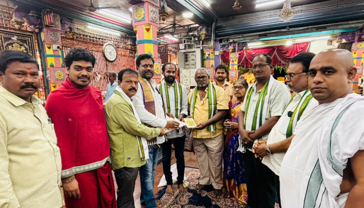 సిగ్మా తెలుగు డాట్, ఇన్ న్యూస్: భీమవరం పురాధీశ్వరి శ్రీశ్రీశ్రీ మావుళ్ళమ్మ అమ్మవారి నిలువెత్తు మూలవిరాట్ స్వరూపానికి సంపూర్ణ స్వర్ణమయం చెయ్యడానికి ఏర్పాటు చేసిన స్వర్ణ నిధికి శృంగవృక్షం కి చెందిన శ్రీ అమ్మవారి భక్తులు పచ్చిపులుసు యానాది శెట్టి అన్నపూర్ణ దంపతులు 64 వేలు రూపాయలు విలువ చేసే 4 గ్రాముల 300 మిల్లిల బంగారం కానుకగా సమర్పించారు,వీరికి ఆలయ అర్చకులు పూజలు ఆశీర్వచనాలు నిర్వహించారు ఆలయ చైర్మన్ బొండాడ నాగభూషణం ప్రసాదం ఫోటో అందచేసినారని ఆలయ అసిస్టెంట్ కమిషనర్ బుద్ద మహాలక్ష్మి నగేష్ తెలిపారు.