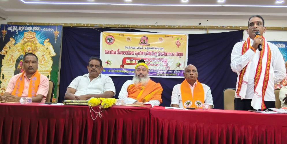 సిగ్మా తెలుగు డాట్, ఇన్ న్యూస్: నేడు, ఆదివారం విశ్వహిందూ పరిషత్ ఆధ్వర్యంలో హిందూ దేవాలయాల స్వయం ప్రతిపత్తి ముసాయిదా చట్టం పై భీమవరంలో ఆదివారం అవగాహన సదస్సును నిర్వహించారు. ఈ సదస్సుకి ప్రధాన వక్త హాజరైన పాకాల త్రినాథ్ మాట్లాడుతూ ఆలయాలకు పూర్తి స్వయం ప్రతిపత్తిని కల్పిస్తూ ప్రభుత్వం వెంటనే చట్ట సవరణ చేయాలన్నారు. ఈలోగా పూజ, ప్రసాద, కైంకర్య సేవలను అత్యంత భక్తిశ్రద్ధలతో నాణ్యతతో నిర్వహించేలా ప్రభుత్వం చర్యలు చేపట్టాలన్నారు. అలాగే వీటి ఆధారంగా నిర్వహించబడుతున్న సేవా సంస్థలో పనిచేస్తున్న అన్యమత ఉద్యోగులను తక్షణం తొలగించాలని డిమాండ్ చేశారు. ట్రస్టు బోర్డులలో హిందూ ధర్మంపై శ్రద్ధ భక్తులతో ధర్మాచరణ చేసే రాజకీయ ఇతర ధార్మిక భక్తులను మాత్రమే నియమించాలన్నారు. ఆలయాల ఆస్తులు అన్యాక్రాంతం కాకుండా, అన్యాక్రాంతమైన ఆస్తులను స్వాధీనం చేసుకొని ఆలయాలకు అప్పగించే బాధ్యత ప్రభుత్వం తీసుకోవాలి అన్నారు. విశ్వహిందూ పరిషత్ రాష్ట్ర అధ్యక్షులు ఒబిలిశెట్టి శ్రీ వెంకటేశ్వర్లు మాట్లాడుతూ దేవాలయాల ఆదాయాన్ని హిందూ ధార్మిక ప్రచారానికి, హిందూ సమాజ సేవలకు మాత్రమే ఉపయోగించాలని అన్నారు. అంతేగాని ప్రభుత్వ కార్యకలాపాలకు ఉపయోగించరాదని స్పష్టం చేశారు. పరిషత్ రాష్ట్ర ఉపాధ్యక్షులు ఉద్దరాజు వేణుగోపాల రాజు, దత్త పీఠాధిపతి శ్రీ నాగానంద సరస్వతి, తదితర ధార్మిక సంస్థల ప్రతినిధులు పాల్గొన్నారు.