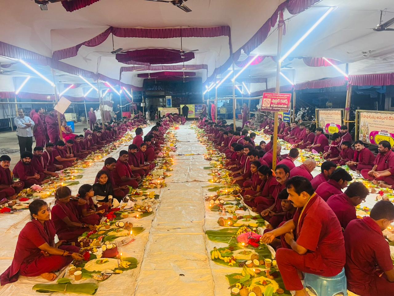 సిగ్మాతెలుగు డాట్,ఇన్ న్యూస్: భీమవరం పురాధీశ్వరి శ్రీశ్రీశ్రీ మావుళ్ళమ్మ అమ్మవారి దేవస్థానం నందు నేడు, సోమవారం శ్రీ మావుళ్ళమ్మ అమ్మవారి అర్ధ మండల దీక్షా మాలధారణ కార్యక్రమం ఘనంగా జరిగింది. నిజానికి 40 రోజుల మండల దీక్షలు ఈ నెల 7 న అశ్వయుజ పౌర్ణమి నాడు ప్రారంభం కాగా.. ఈరోజు అర్ధమండల దీక్ష కార్యక్రమం ఆలయ ప్రధాన అర్చకులు బ్రహ్మ శ్రీ మద్దిరాల మల్లికార్జున శర్మ కలశస్థాపన పూజ జరిపి, ప్రారంబించారు 320 మంది భక్తులు దీక్షా మాలధారణ ధరించారని, అఖరుగా పాదమండల దీక్ష వచ్చే నెల 6 న ప్రారంభం కానుందని…శ్రీ అమ్మవారి భక్తులు సిద్ధంగా ఉండాలని తెలిపారు. వీరందరి దీక్ష విరమణ మహాపూర్ణాహుతి వచ్చే నెల 16 ఆదివారం జరుపబడును అని ఆలయ సహాయ కమిషనర్ బుద్ధ మహాలక్ష్మి నగేష్ తెలిపారు.