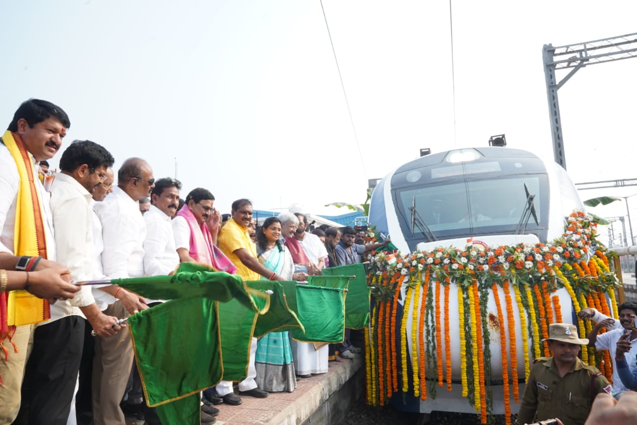 సిగ్మాతెలుగు డాట్, ఇన్ న్యూస్: నేటి సోమవారం మధ్యాహ్నం నరసాపురం – చెన్నై వందే భారత్ రైలు ను కేంద్ర ఉక్కు, భారీ పరిశ్రమల శాఖ సహాయ మంత్రి భూపతిరాజు శ్రీనివాస వర్మ అశేష జనవాహిని మధ్య లాంఛనంగా జెండా ఊపి నరసాపురం నుండి ప్రారంభించారు. ఈ కార్యక్రమంలో మంత్రి డాక్టర్ నిమ్మల రామానాయుడు, శాసనసభ ఉపసభాపతి కనుమూరి రఘురామకృష్ణంరాజు, జిల్లా కలెక్టర్ చదలవాడ నాగరాణి, జిల్లా ఎస్పీ అద్నాన్ నయీo అస్మి, నరసాపురం, తాడేపల్లిగూడెం శాసనసభ్యులు, ప్రభుత్వ విప్ లు బొమ్మిడి నాయకర్, బొలిశెట్టి శ్రీనివాస్, భీమవరం శాసనసభ్యులు పులపర్తి రామాంజనేయులు, ఏపీఐఐసీ చైర్మన్ మంతెన రామరాజు, రాష్ట్ర మహిళా ఆర్థిక కార్పొరేషన్ చైర్పర్సన్ పీతల సుజాత, మైనార్టీ కార్పొరేషన్ చైర్మన్ షరీఫ్, కూటమి నాయకులు తదితరులు పాల్గొన్నారు. ఈ సందర్భంగా ఏర్పాటు చేసిన సభలో కేంద్ర మంత్రి శ్రీనివాస వర్మ మాట్లాడుతూ..వందే భారత్ రైలు ప్రయాణం వర్తక, వాణిజ్య వ్యాపారాలకు, తీర ప్రాంత మత్స్య పరిశ్రమ అభివృద్ధిలో కోస్తా జిల్లా మణిహారంగానిలుస్తుందని, చదువుకునే విద్యార్థులకు, సాఫ్ట్వేర్ ఉద్యోగాలకు చెన్నై వెళ్లే వారికి తక్కువ సమయంలో కేవలం 9 గంటల సమయంలో వెళ్లేందుకు చాలా సౌకర్యవంతంగా ఉంటుందన్నారు. మత్స్య పరిశ్రమ పురోభివృద్ధి చెందాలంటే రైలు కనెక్టివిటీ చాలా ముఖ్యమన్నారు.నర్సాపురం నుండి భీమవరం, గుడివాడ, విజయవాడల మీదుగా హైదరాబాద్, బెంగళూరు వెళ్లే వందే భారత్ రైలు సర్వీసులకోసం సంబంధిత కేంద్ర మంత్రితో, అధికారులతో చర్చలు జరుపుతున్నట్లు శ్రీనివాస వర్మ తెలిపారు. సికింద్రాబాద్ నుండి విశాఖపట్నం వెళ్లే వందే భారత్ రైలు తాడేపల్లిగూడెంలో కూడా ఆగేలా ఏర్పాటు చేస్తానన్నారు.