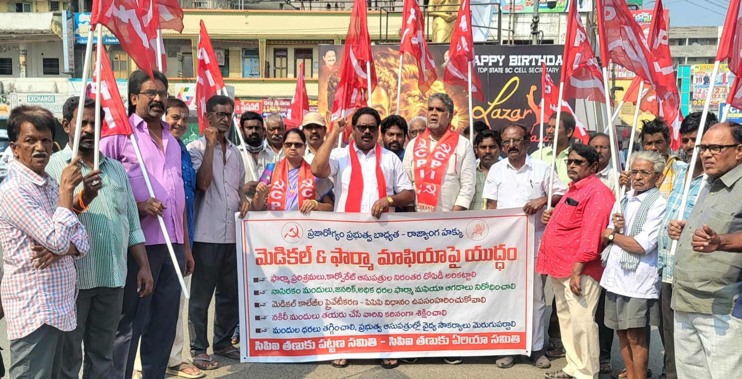 సిగ్మాతెలుగు డాట్, ఇన్ న్యూస్: పశ్చిమ గోదావరి జిల్లాలో మెడికల్ అండ్ ఫార్మా మాఫియా ను అరికట్టి ప్రజల ఆరోగ్యాన్ని పరిరక్షించాలని సీపీఐ రాష్ట్ర వ్యాపిత పిలుపు మేరకు నేడు, శనివారం తణుకు నరేంద్ర సెంటర్ లో సీపీఐ ఆధ్వర్యంలో ధర్నా నిర్వహించారు. ధర్నా నుద్దేశించి పార్టీ జిల్లా కార్యదర్శిభీమారావు మాట్లాడుతూ..రాష్ట్ర వ్యాప్తంగా, జిల్లా వ్యాప్తంగా కార్పోరేట్,ప్రైవేట్ హాస్పిటల్స్ లో దోపిడీ తీవ్రంగా వుందన్నారు. ఈ హాస్పటల్స్ పై అధికారులు దాడులు నిర్వహించి అధిక బిల్లుల వసూలు నియంత్రించాలన్నారు. ఫార్మా కంపెనీలు ధనార్జనే లక్ష్యంగా నకిలీ,చవక బారు మందులు తయారీతో ప్రజల ప్రాణాలతో చెలగాటమాడుతున్నారన్నారు.రాష్ట్ర ప్రభుత్వం నిరంతర తనిఖీలు నిర్వహించి మెడికల్, ఫార్మా మాఫియాపై ఉక్కుపాదం మోపాలని భీమారావు డిమాండ్ చేశారు. ఈ కార్యక్రమంలో సీపీఐ తణుకు పట్టణ కార్యదర్శి బొద్దాని నాగరాజు ఏరియా కార్యదర్శి సికిలే పుష్పకుమారి, నామాన వెంకటేశ్వరరావు, బొద్దాని కృష్ణ కిషోర్, పెదపోలు వెంకట్రావు,సీపీఐ నాయకులు డివిఎన్ హనుమంతరావు తదితరులు పాల్గొన్నారు.
